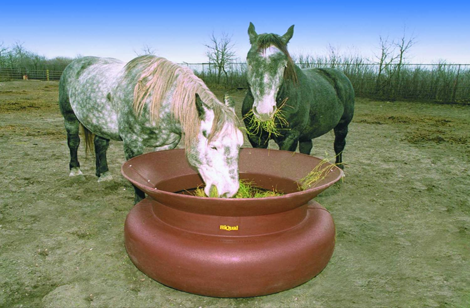 HiQual's patented Ground Feeder is a safe, cost effective and natural feeding alternative for feeding small square bales. The bell shaped design eliminates "spooning" and reduces waste. The rotational molded virgin poly material is highly durable and animal safe.